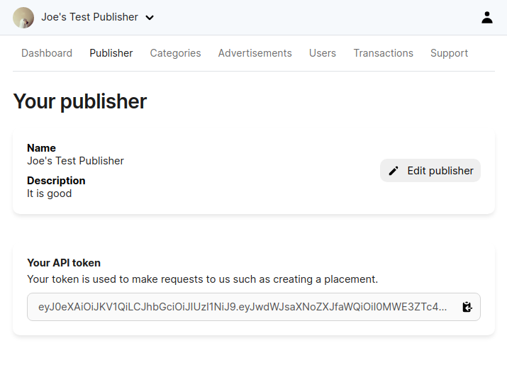 You can find your API token by going to the Publisher Dashboard > Publisher > Your API token.
